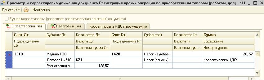 Также сформируется записи в регистр накопления «Корректировка НДС», что позволит отразиться данной сумме в Приложении 300.06 формы 300.00 «Декларация по Налогу на добавленную стоимость».
