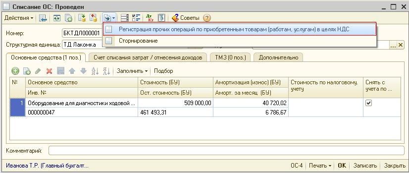Рассмотрим оформление корректировки зачетного НДС на примере документа «Списание ОС».