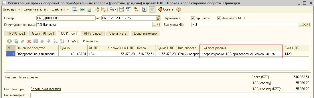 Табличная часть документа «Регистрация прочих операций по приобретенным товарам в целях НДС» будет заполнена данными документа по списанию активов.