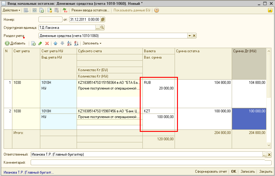 Это правило распространяется и на те ситуации, когда начальные остатки вводятся в валюте тенге по счету, у которого установлен признак «Валютный».