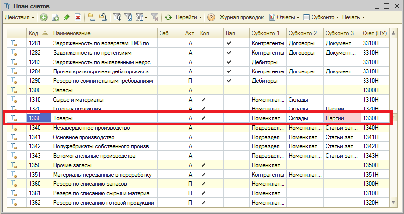 В том случае, если для каких-либо счетов учета ТМЗ установлен способ оценки запасов, отличный от способа «По средней», тогда для этого счета в плане счетов будет автоматически добавлено третье субконто «Партия».