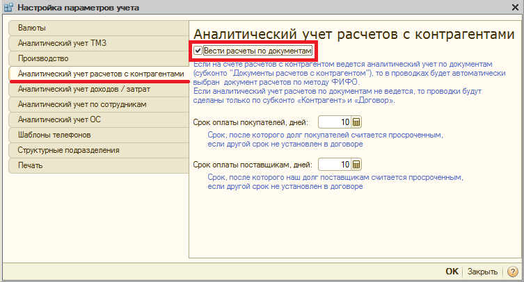 Если на предприятии существует необходимость ведения аналитического учета взаиморасчетов с контрагентами по документам, тогда при первоначальной настройке программы в «Настройках параметров учета» (меню «Предприятие» — «Настройка параметров учета») требуется установить признак «Вести расчеты по документам» на закладке «Аналитический учет расчетов с контрагентами».