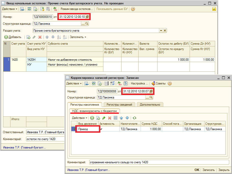 Учет налога на добавленную стоимость в конфигурации «Бухгалтерия для Казахстана» организован не только на счетах бухгалтерского учета, но и преимущественно на регистрах накопления. Для того, чтобы сумма НДС к зачету, отраженная при вводе начальных остатков на счете 1420 «Налог на добавленную стоимость», учитывалась при расчетах по НДС в последующих налоговых периодах, необходимо помимо проводок по бухгалтерскому учету также ввести сведения о суммах НДС к зачету в регистр накопления «НДС, взаиморасчеты с бюджетом» на дату ввода начальных остатков. Корректировка регистра «НДС, взаиморасчеты с бюджетом» выполняется с помощью документа «Корректировка записей регистров» (меню «Операции») по виду движения «Приход».
