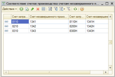 Если на момент ввода начальных остатков на предприятии существуют остатки по незавершенному производству (далее НЗП), учитываемому на счетах раздела 1340 «Незавершенное производство», то для дальнейшего корректного учета сумм НЗП в составе себестоимости готовой продукции необходимо выполнить следующие действия. На начальном этапе выполняется настройка регистра сведений «Соответствие счетов производства счетам незавершенного производства» (меню «Предприятие» — «Учетная политика»).
