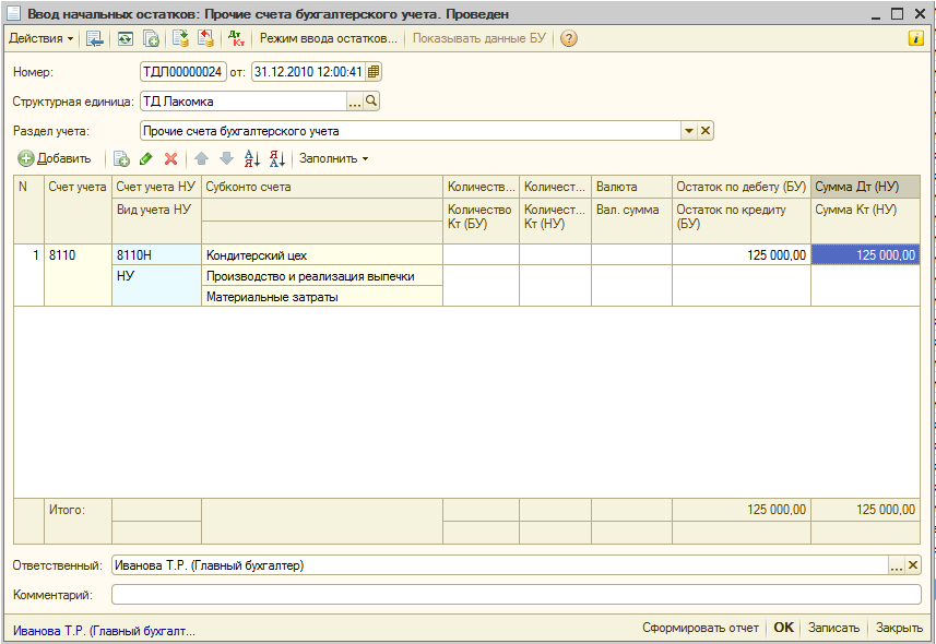В шапке документа присутствует реквизит «Подразделение», которое не является обязательным для заполнения. То есть документ «Ввод начальных остатков по зарплате» может быть создан один на всех работников организации.