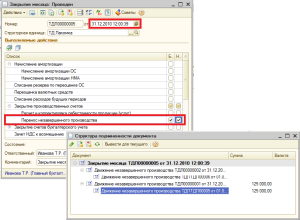 Затем, датой ввода начальных остатков, создается документ «Закрытие месяца» с установленным видом операции «Перенос незавершенного производства» из раздела «Закрытие производственных счетов», который при проведении создаст два документа «Движение незавершенного производства».