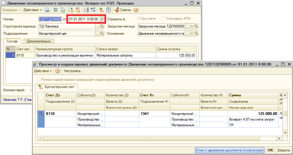 Второй документ на начало следующего месяца выполнит возврат сумм НЗП со счетов учета незавершенного производства на счета производственного учета.