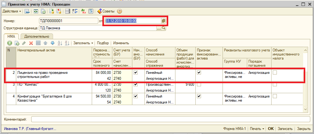 Затем, датой ввода начальных остатков, но временем позже, создается документ «Принятие к учету НМА», с помощью которого задаются параметры начисления амортизации, а также параметры налогового учета по нематериальному активу.
