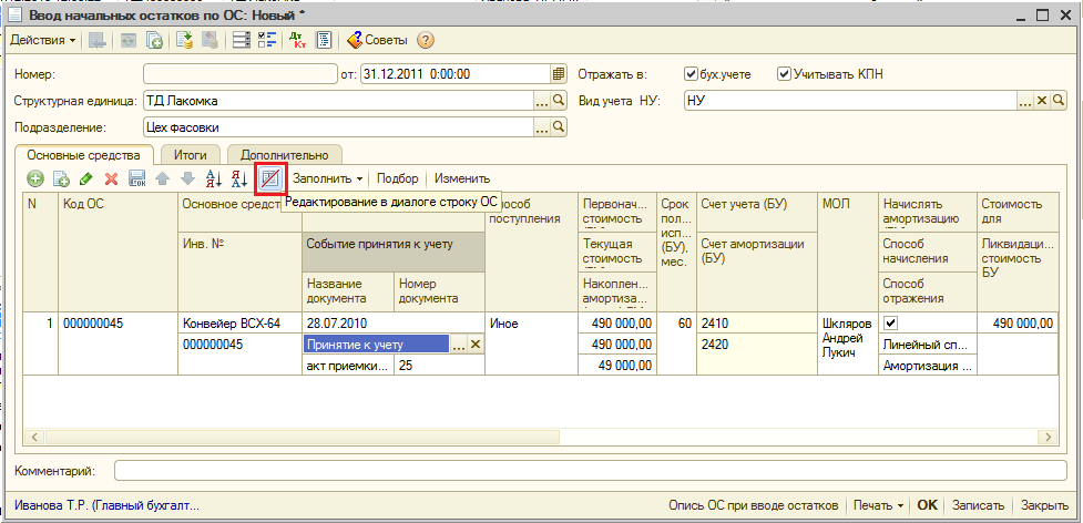 Ввод начальных остатков по основным средствам