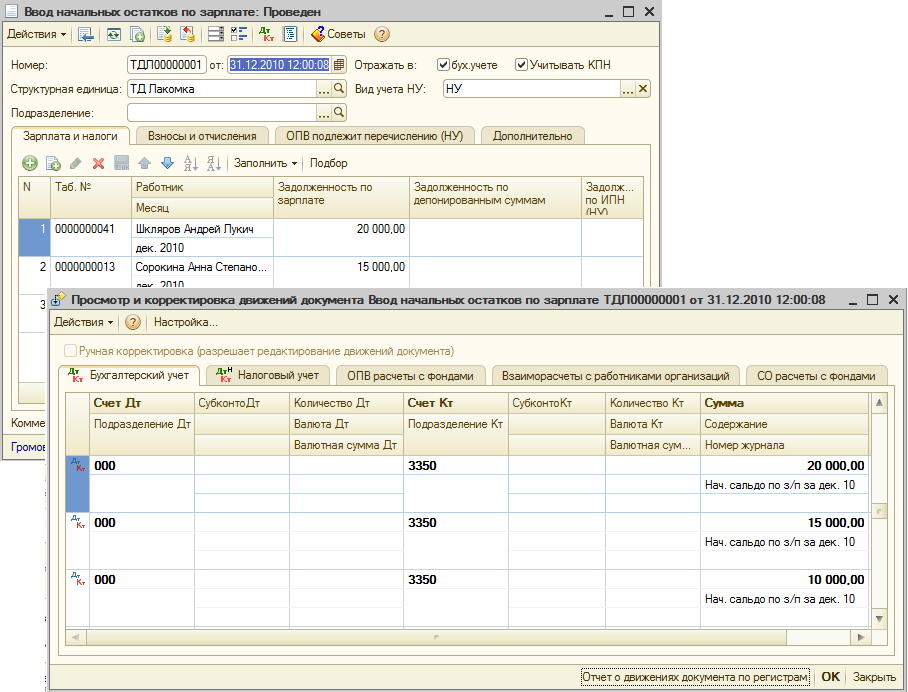 Ввод начальных остатков по заработной плате