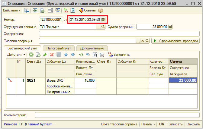 При проведении документа «Ввод начальных остатков по ОС» следует контролировать время документа, время не должно быть равно 00.00.00.