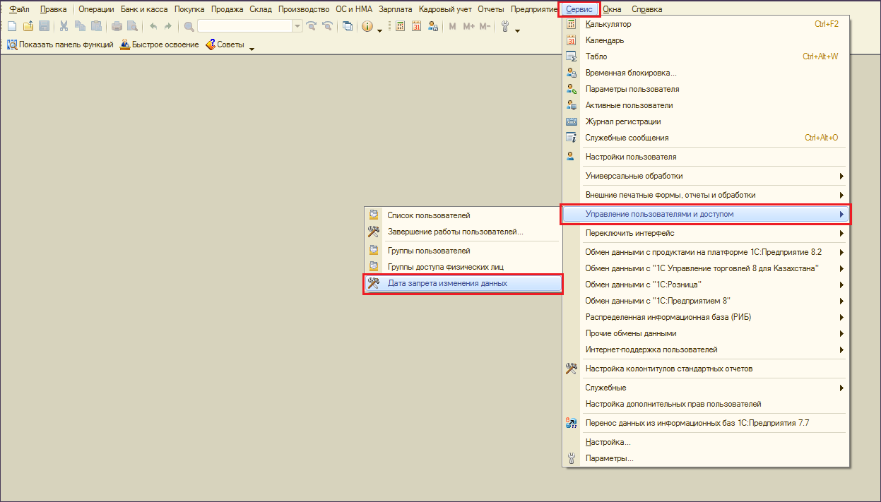 Рассмотрим более подробно действие механизма установки даты запрета изменения данных, а также порядок выполнения настроек, позволяющих использовать этот механизм. Итак, настройка «Дата запрета изменения данных» позволяет установить ограничения на изменение данных ранее определенной даты. Это бывает необходимо в случае, когда отчетность за период сдана и существует необходимость «защитить» данные от случайного изменения. Данная настройка может быть вызвана на экран через пункт меню «Сервис» – «Управление пользователями и доступом» - «Дата запрета изменения данных».