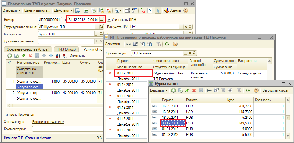 При такой настройке даты запрета изменения данных, пользователю Иванова Т.Р. (главный бухгалтер) будет запрещено изменять документы, созданные ранее даты 01.01.2012 года.