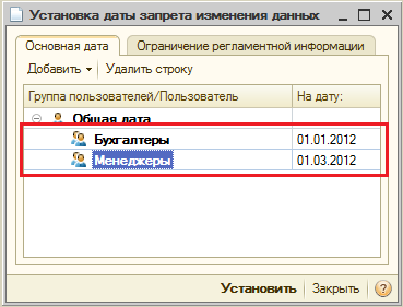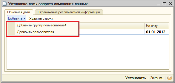 При установке даты запрета следует учитывать, что под действие данного ограничения попадают данные, период действия которых ограничен концом предыдущего дате запрета дня. То есть, например, при установке значения 01.01.2012, изменение данных будет возможно только, начиная с 01.01.2012 00:00:00 включительно.