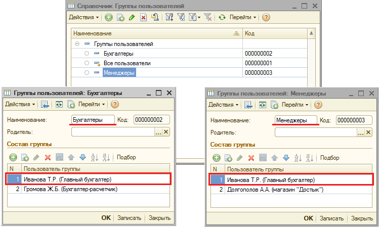 В случае если дата запрета изменения данных устанавливается для групп пользователей, и один и тот же пользователь одновременно входит в несколько групп, в качестве ограничивающей даты берется минимальная из дат, установленных для этих групп пользователей. Например, пользователь Иванова Т.Р. (главный бухгалтер) входит одновременно в группу пользователей «Менеджеры» и «Бухгалтеры».