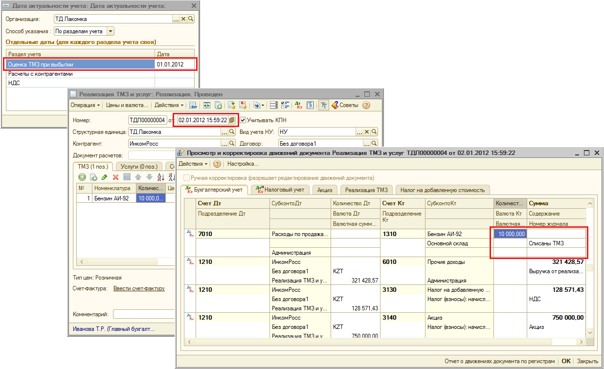В момент проведения документов списания ТМЗ осуществляется анализ данных по таким направлениям, как наличие остатков требуемой номенклатуры на момент списания по заданным параметрам (дата списания, склад, счет учета, партии), а также расчет себестоимости в зависимости от способа оценки запасов. В том случае, если информационная база содержит большой объем данных, тогда анализ и выполнение данных расчетов может занять относительно продолжительный период времени, установка даты актуальности учета по разделу «Оценка ТМЗ при выбытии» позволяет отменить выполнение расчетов по определению остатков и себестоимости. При проведении документов списания ТМЗ («Реализация ТМЗ и услуг», «Списание ТМЗ»), в проводке по списанию себестоимости количество установиться такое, которое указано в документе списания (без учета имеющегося остатка), а суммовой показатель данной проводки останется не заполненным (поскольку расчет себестоимости в момент проведения не осуществлялся).