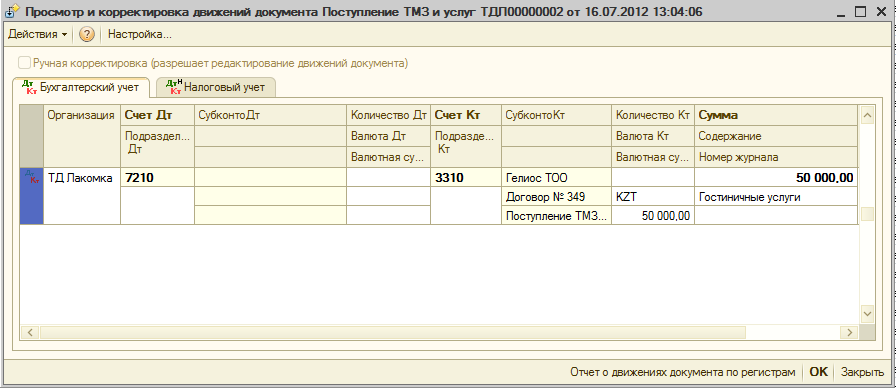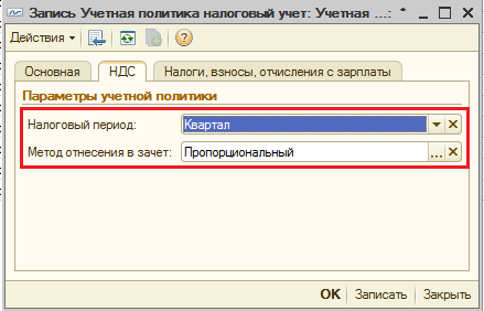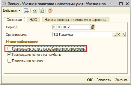 При такой настройке в документах, оформленных в указанном периоде, начиная с даты снятия с учета по НДС и до даты, установленной в регистре сведений «Учетная политика (налоговый учет)», будут отсутствовать проводки по учету НДС, а также движения в соответствующие регистры накопления.