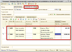 Для ввода остатков по товарам необходимо «вручную» рассчитать суммы НДС, относимого в зачет по каждому виду товара и оформить документ «Операция бухгалтерский (налоговый) учет» (меню «Операции») на дату постановки на учет по НДС по счету 1420 в корреспонденции со счетом учета ТМЗ.