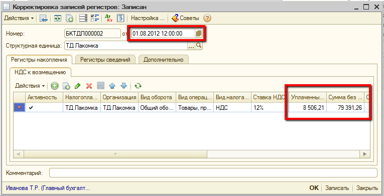 Для формирования записей в регистре «НДС к возмещению» необходимо оформить документ «Корректировка записей регистров» и выполнить корректировку регистра накопления «НДС к возмещению» датой постановки на учет по НДС.