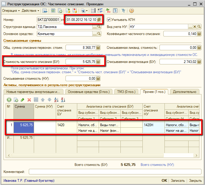 Документ «Реструктуризация ОС» позволяет сформировать проводки по бухгалтерскому учету по списанию части балансовой стоимости основного средства на счет 1420, а также позволяет выполнить пересмотр параметров начисления амортизации и, соответственно, сформировать записи в регистры сведений по учету основных средств одновременно. Документ «Реструктуризация ОС» создается на дату постановки на учет по НДС с видом операции «Частичное списание». В данном документе на закладке «Прочие» нужно указать счет списания 1420 и сумму, равную стоимости частичного списания балансовой стоимости основного средства.