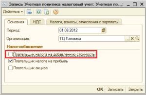 Для настройки программы в данной ситуации необходимо в регистре сведений «Учетная политика (налоговый учет)» добавить новую запись, установить период – 01 августа и снять признак «Плательщик налога на добавленную стоимость».