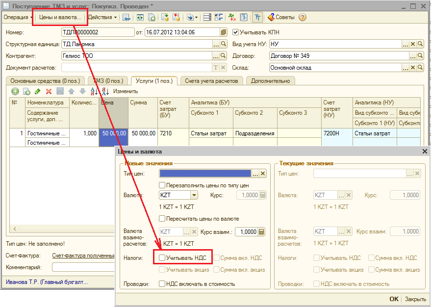 Кроме того, при оформлении документов поступления и реализации в периоде начиная с даты снятия с учета по НДС и до даты, установленной в регистре «Учетная политика (налоговый учет)», то есть с 5 июля и до 31 июля, необходимо снимать признак «Учитывать НДС» по кнопке «Цены и валюта».