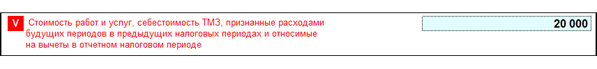 По РБП, приобретенным в прошлых периодах, в Декларации отражается непосредственно сумма, которая в текущем периоде отнесена на вычеты. Обратите внимание, что строка 100.00.009V «Стоимость работ и услуг, себестоимость ТМЗ, признанные расходами будущих периодов в предыдущих налоговых периодах и относимые на вычеты в отчетном налоговом периоде» предназначена только для РБП, приобретенных в предыдущих отчетных периодах. Сальдо этого вида РБП при заполнении формы в конфигурации не учитывается в строке 100.00.009IX, чтобы не завысить вычет в строке 100.00.009.
