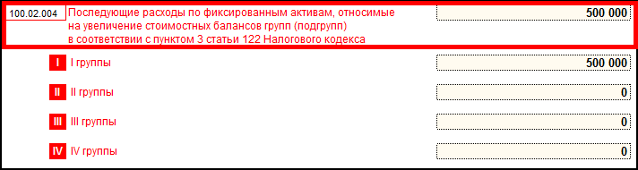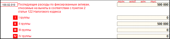 Расходы по капитальному ремонту отражаются в приложении 100.02 «Вычеты по фиксированным активам» и увеличивают стоимостной баланс групп на конец налогового периода.