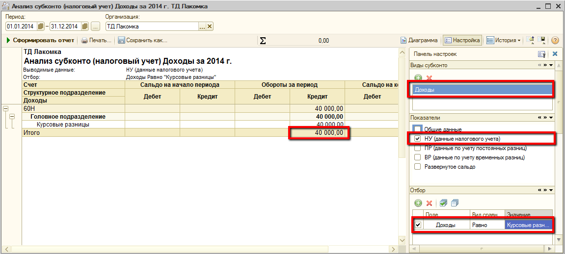 Проверить корректность расчета и отражения курсовых разниц можно при помощи отчета Анализ субконто (НУ).
