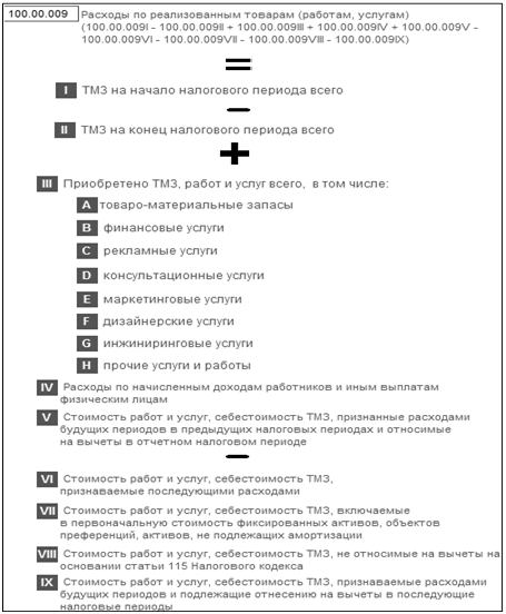 В строке 100.00.009 Расходы по реализованным товарам (работам, услугам) указывается себестоимость реализованных (использованных) товаров, стоимость приобретенных работ, услуг, относимые на вычеты в соответствии со статьей 100 Налогового Кодекса.