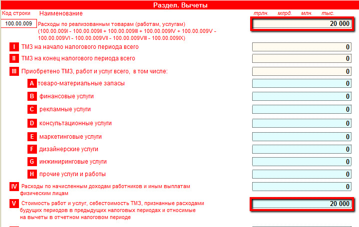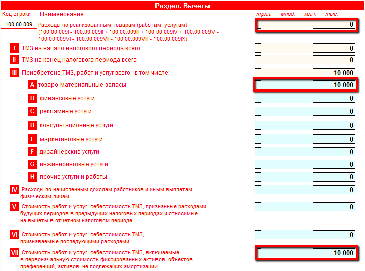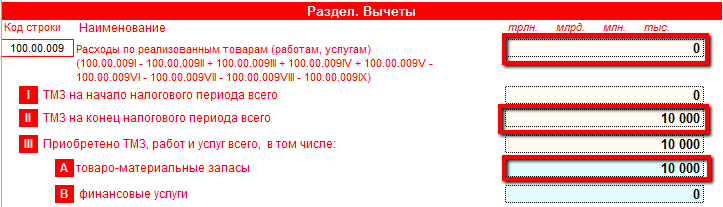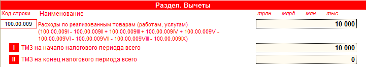 Пример: У организации на начало налогового периода имеются ТМЗ на сумму 10 000 тг. В отчетном периоде ТМЗ были реализованы. Таким образом, в Декларации за период отразятся следующие данные: строка 100.00.009I – 10 000 тг., строка 100.00.009II - 0 тг. (ТМЗ реализованы). У организации образуется вычет в размере 10 000 тг. по строке 100.00.009.
