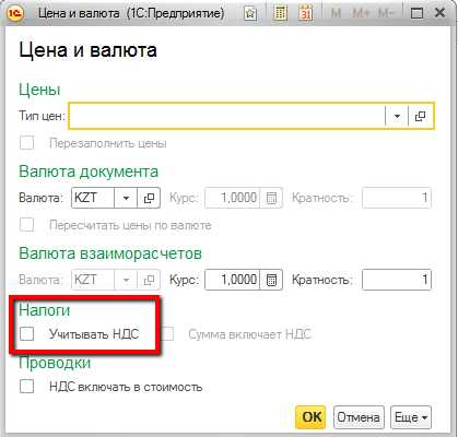 При отражении операций поступления, по которым необходимо произвести начисление НДС за нерезидента необходимо отключить стандартные механизмы по принятию НДС в зачет в момент поступления, так как НДС по данным операциям относится в зачет только после оплаты. Для этого в документах поступления (например, в документе Поступление ТМЗ и услуг) необходимо снять признак «Учитывать НДС» с помощью гиперссылки «Цена и валюта».