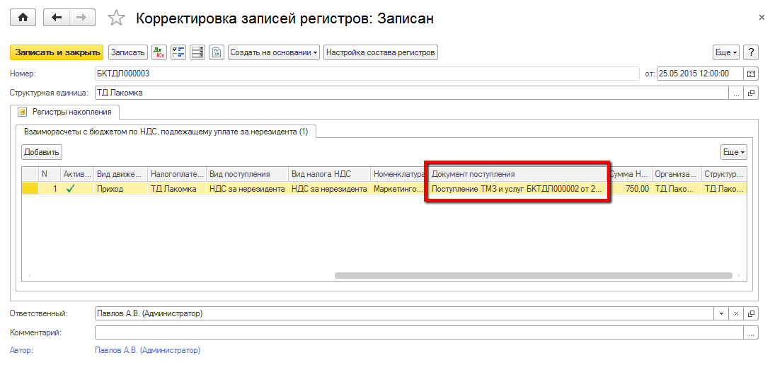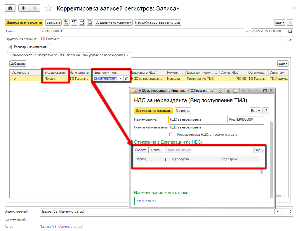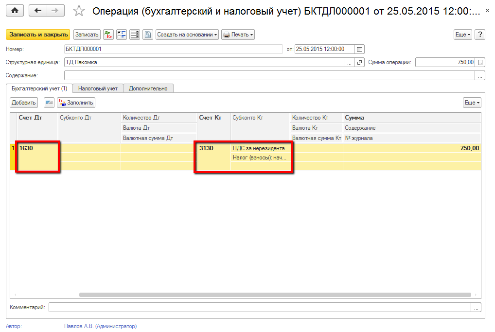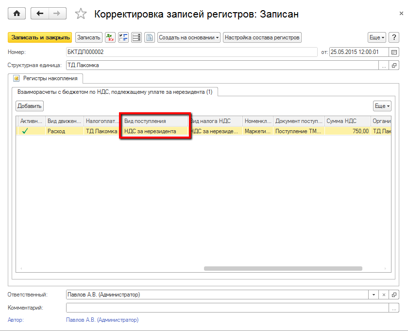 При этом необходимо учитывать, что и на счетах бухгалтерского учета, связанных с НДС, и в регистре накопления необходимо указывать вид НДС — «НДС за нерезидента».