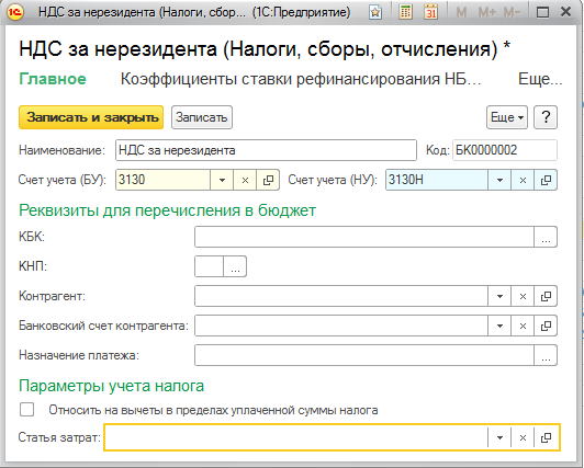 Если в справочнике «Налоги, сборы, отчисления» отсутствует вид по НДС за нерезидента, то необходимо создать новый элемент «НДС за нерезидента».