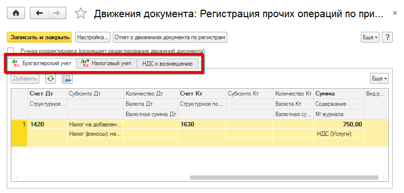 При проведении документа Регистрация прочих операций по приобретенным товарам (работам, услугам) в целях НДС формируются проводки по счетам учета и движения в регистр накопления «НДС к возмещению».
