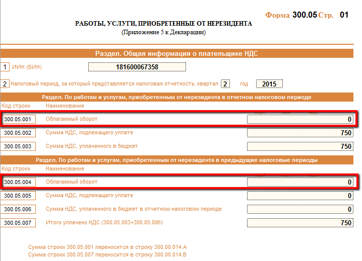 При формировании Приложения 300.05 «Работы, услуги, приобретенные от нерезидента» Декларации по НДС, следует обратить внимание, что строки 300.05.001 и 300.05.004 заполняются пользователями самостоятельно.