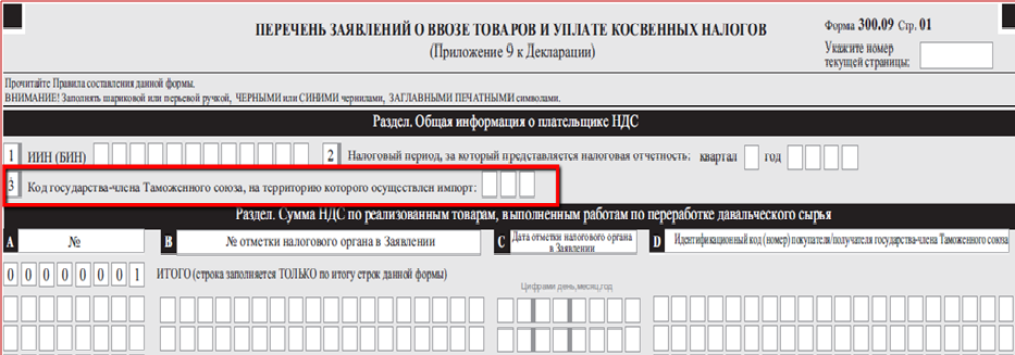 Для каждого государства-члена ТС в приложении 300.09 заполняется отдельный лист. Для этого в верхней части страницы содержится строка для указания кода государства, на территорию которого осуществлен экспорт.