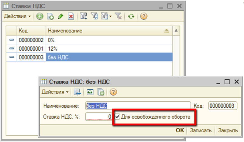 Признак «Для освобожденного оборота» может быть установлен в справочнике «Ставки НДС», который можно открыть с помощью меню Предприятие - Налоги - Налог на добавленную стоимость - Ставки НДС.