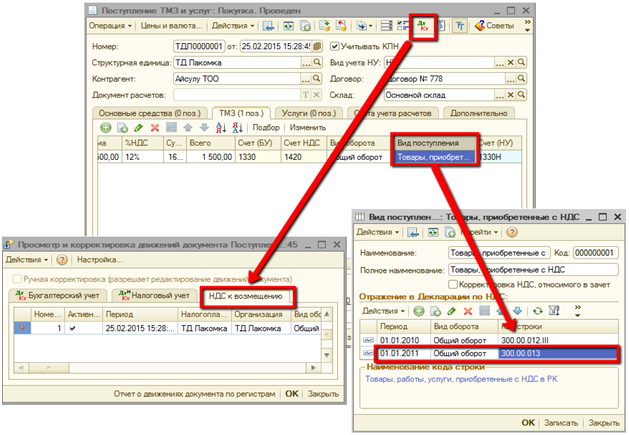 - Корректировка НДС к возмещению. Данный регистр предназначен для учета операций корректировки НДС, относимого в зачет, которые подлежат отражению в приложении 300.06: при операциях, предусмотренных статьями 258 и 259 НК РК.