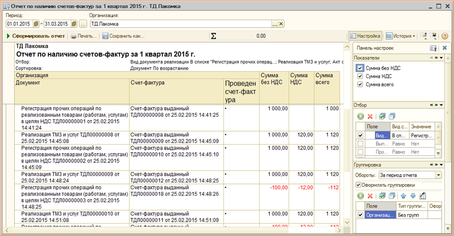 В отчетах отражаются данные о проведении счетов-фактур и данные по суммам, отраженным в счетах-фактурах.
