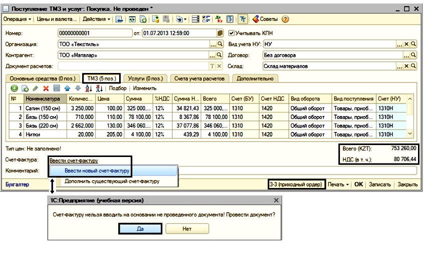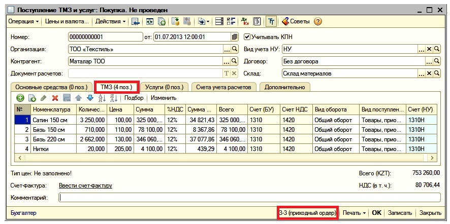 При поступлении ТМЗ от поставщиков оформляется электронный документ «Поступление ТМЗ и услуг», печатной формой которого является первичный документ «Приходный ордер запасов». Если организация является плательщиком налога на добавленную стоимость (НДС) в соответствии со статьей 228 Налогового кодекса Республики Казахстан, необходимо зарегистрировать документ «Счет-фактура полученный» после проведения электронного документа «Поступление ТМЗ и услуг».