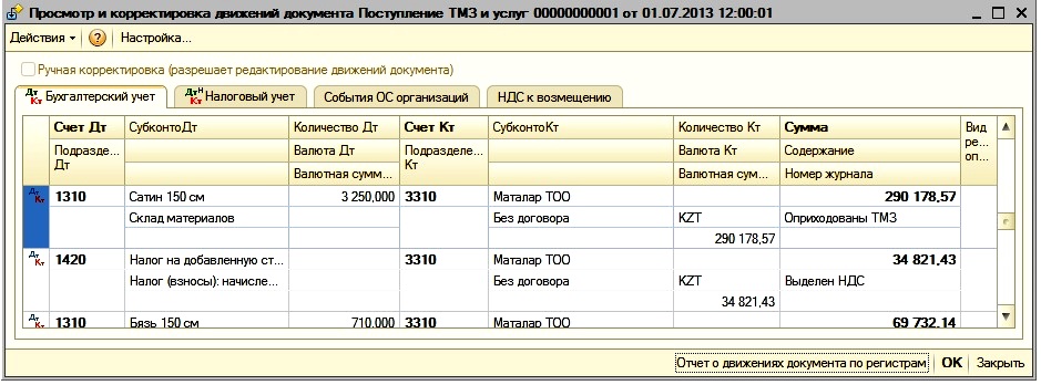 Для просмотра бухгалтерских проводок документа «Поступление ТМЗ и услуг» воспользуемся кнопкой Результат проведения. При этом откроется обработка «Просмотр и корректировка движений документа Поступление ТМЗ и услуг 000001 от 01.07.2013», в закладке «Бухгалтерский учет» будут представлены проводки (рис. 4):