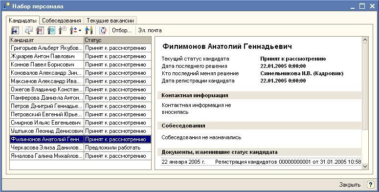 Инструмент позволяет работать со списком кандидатов, назначать им собеседования, регистрировать оценки результатов собеседования и принимать на работу. На закладке «Текущие вакансии» можно сформировать отчет по занятым и свободным вакансиям на предприятии. Для ведения учета работы с кандидатами в конфигурации предназначены документы «Регистрация кандидатов», «Регистрация собеседования с кандидатом», «Электронное письмо», «Оценка кандидата» и «Оценка испытательного срока».