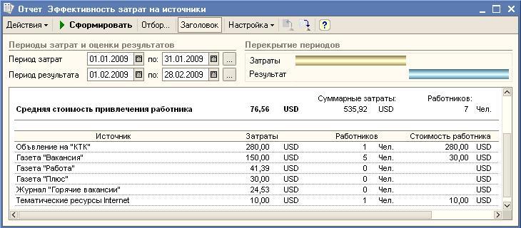 При подаче объявлений в издания и кадровые агентства на наличие вакансий в конфигурации можно регистрировать затраты на привлечение персонала. Для этого предназначена специальная система учета затрат. Затраты на привлечение персонала вводятся документом «Учет затрат на источники персонала». После внесения информации по израсходованным средствам можно получить отчет «Эффективность затрат на привлечение», который позволяет оценить стоимость привлечения одного кандидата или работника по каждому источнику и среднюю стоимость привлечения по всем источникам.
