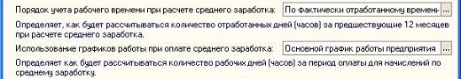 Варианты сбора отработанного и оплачиваемого времени определяются настройками учетной политики по персоналу организаций «Порядок учета рабочего времени при расчете среднего заработка» и «Использование графиков работы при оплате среднего заработка» соответственно (меню «Предприятие» — «Учетная политика» — «Учетная политика по персоналу организаций»).