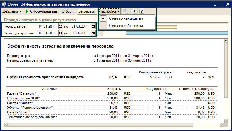 Отчет можно формировать в 2-х режимах – «по кандидатам» и «по работникам». В первом случае анализируются все затраты по каждому источнику и определяется себестоимость 1 кандидата. Во втором случае анализируются затраты и количество лишь тех кандидатов, которых приняли на работу. Также в отчете можно указать период, в котором были фактически понесены затраты и период получения результата по привлечению кандидатов.