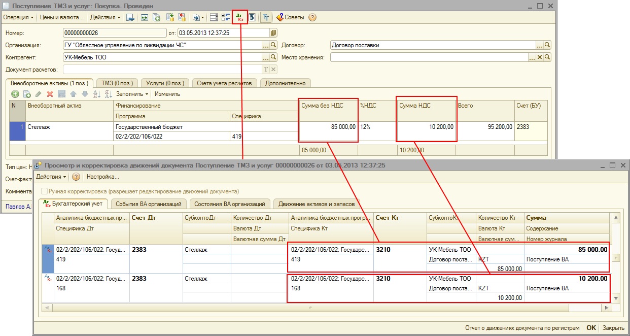 Например, учреждением был приобретен внеоборотный актив «Стеллаж» у поставщика, являющегося плательщиком НДС на сумму 95 200 тг., из которой 10 200 тг. – это НДС, соответственно, сумма без НДС будет равна 85 000 тг.
