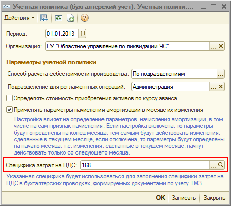 В регистре сведений «Учетная политика (бухгалтерский учет)» необходимо указать специфику, которая будет использоваться в качестве специфики затрат на НДС при формировании бухгалтерских проводок по учету товаров и внеоборотных активов. Следует обратить внимание на то, что при обновлении информационной базы на релиз 3.0.8 в учетной политике по бухгалтерскому учету в качестве специфики затрат на НДС автоматически устанавливается специфика 168.