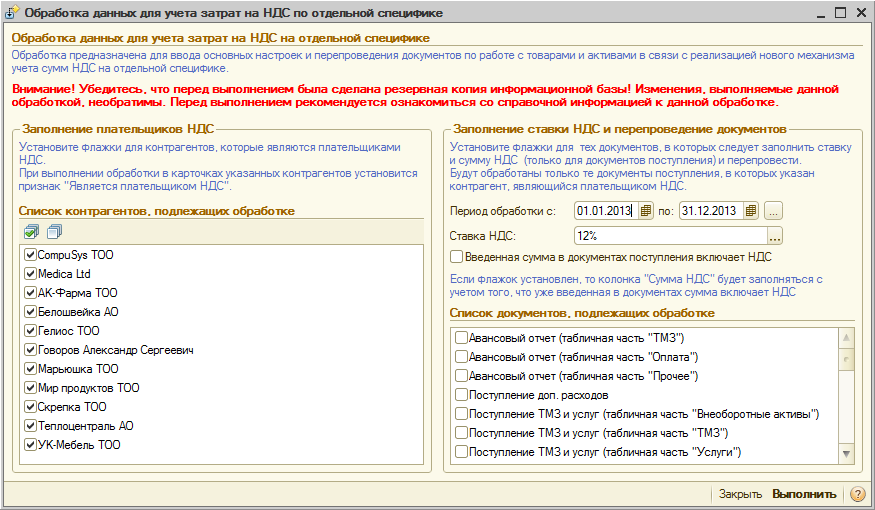 Автоматически запустится обработка-помощник перехода на раздельный учет стоимости активов (ТМЗ) и затрат на НДС. Обработка предназначена для выполнения ряда действий над справочниками и документами информационной базы, связанных с реализацией нового механизма учета сумм НДС на отдельной специфике.