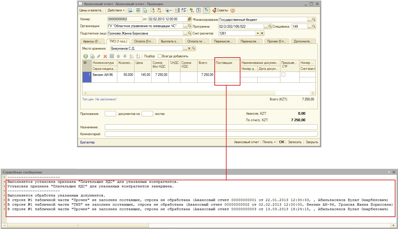 При обработке авансовых отчетов, плательщик НДС будет определяться по значению колонки «Поставщик» табличных частей «ТМЗ» и «Прочее». Если поставщик не заполнен, то строка обрабатываться не будет, и об этом также будет выдано сообщение.
